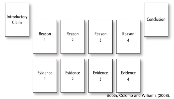 - The content of your paragraphs should revolve around a topic sentence. Following the example of Booth, Colomb and Williams (2008), this sentence would be, for example, your Reason 1. You do not want to use the text of your Evidence 2 in the paragraph of Reason 1. Do not mix 20 different discussions in a single paragraph — keep it simple.