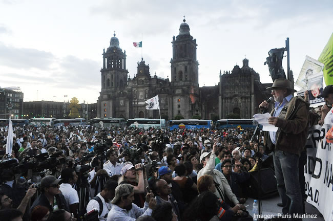 Al conocerse la noticia del asesinato de Juanelo, un grupo de personas cercanas a Javier Sicilia decidió montar una ofrenda afuera del Palacio de Gobierno de Morelos en protesta por el crimen y para evitar la criminalización de las víctimas; además, realizaron una marcha en el centro de Cuernavaca y una serie de lecturas de poesía. Al cabo de dos días, Javier regresó al país y, por insistencia de la prensa, ofreció una conferencia en la que anunció una marcha para el 6 de abril. En seguida, el poeta publicó su ahora famoso artículo “Estamos hasta la madre”, en el que delineó la importancia de articular grandes movilizaciones sociales para exigir a la élite política y a los grupos criminales el cese de la violencia. Ante de la masiva respuesta en la marcha del 6 de abril, el grupo organizador buscó ampliar el alcance de las protestas al ámbito nacional y movilizar a la “reserva moral” del país (Ameglio, 2011). Así, acompañado por cientos de familiares de víctimas, activistas, representantes de pueblos originarios y de organizaciones sociales, Javier encabezó la Marcha por la paz con justicia y dignidad. Luego de tres días de caminar desde Cuernavaca, decenas de miles de personas marcharon hacia el Zócalo de Ciudad de México el 8 de mayo.